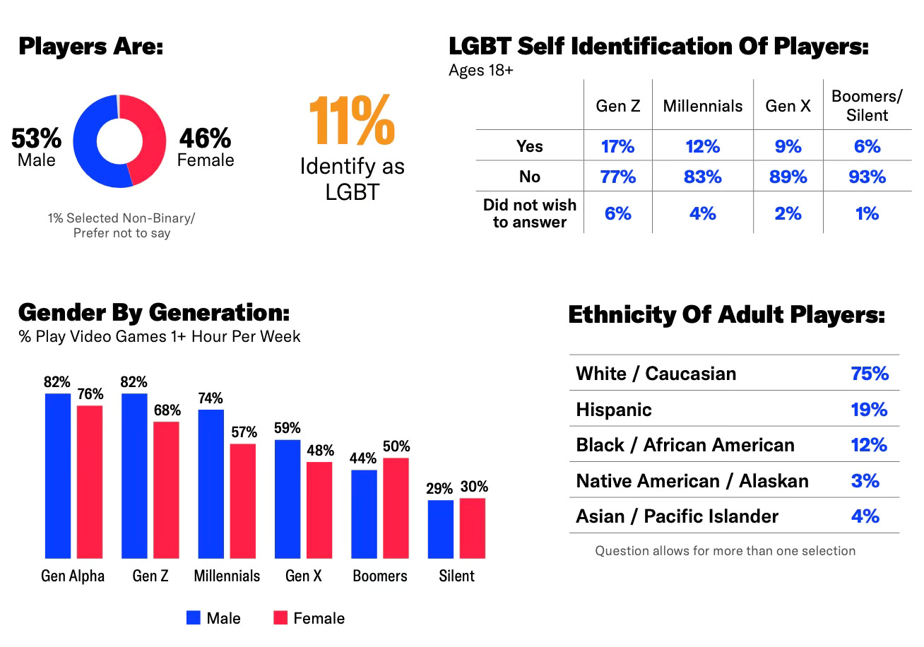 53% of gamers are male; 46% are female. 1% identify as non-binary. 11% identify as LGBT.