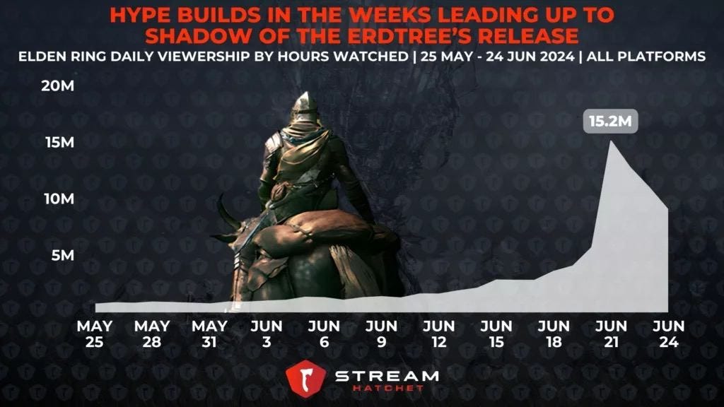 - StreamHatchet: The Release of Elden Ring: Shadow of the Erdtree significantly increased Elden Ring’s popularity on Streaming Platforms