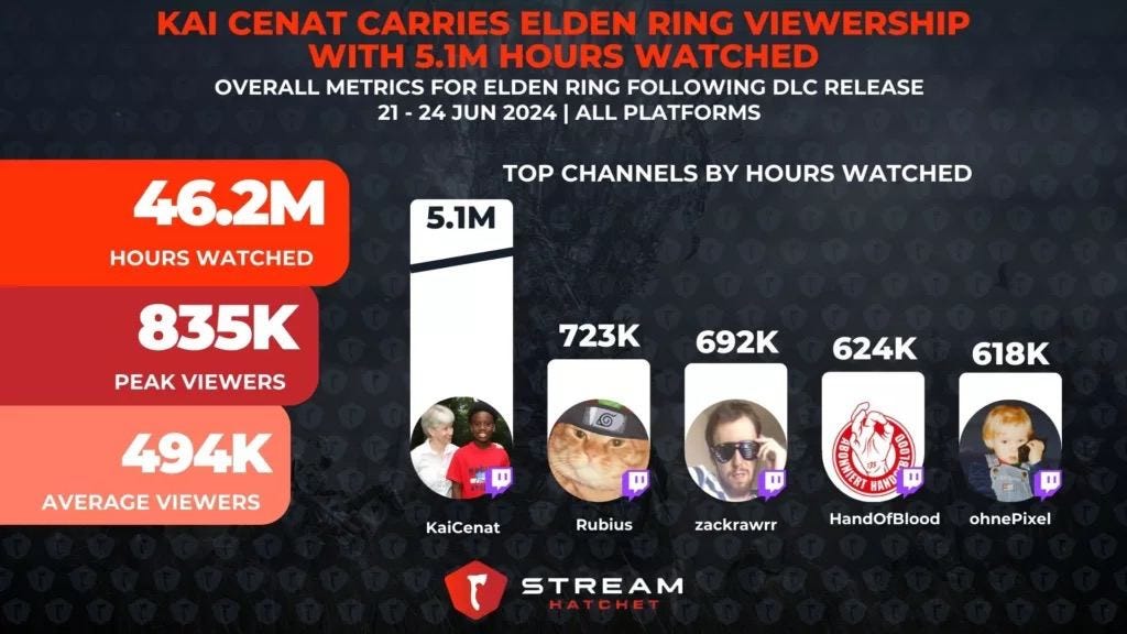 - KaiCenat’s streams of the Elden Ring DLC garnered 5.1 million viewer hours. This is 11% of the total viewing volume for the game after the DLC release.