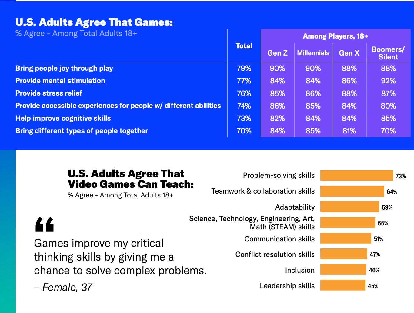 People mainly play to relax and have fun. Overall, the American audience believes that games help cope with stress; develop social skills; improve problem-solving skills; and enhance cognitive functions.
