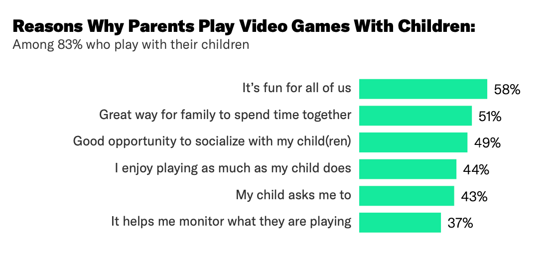 72% of parents play games with their children. They note that it is fun (58%); helps spend quality time together (51%); and is a great opportunity to socialize with the child (49%).