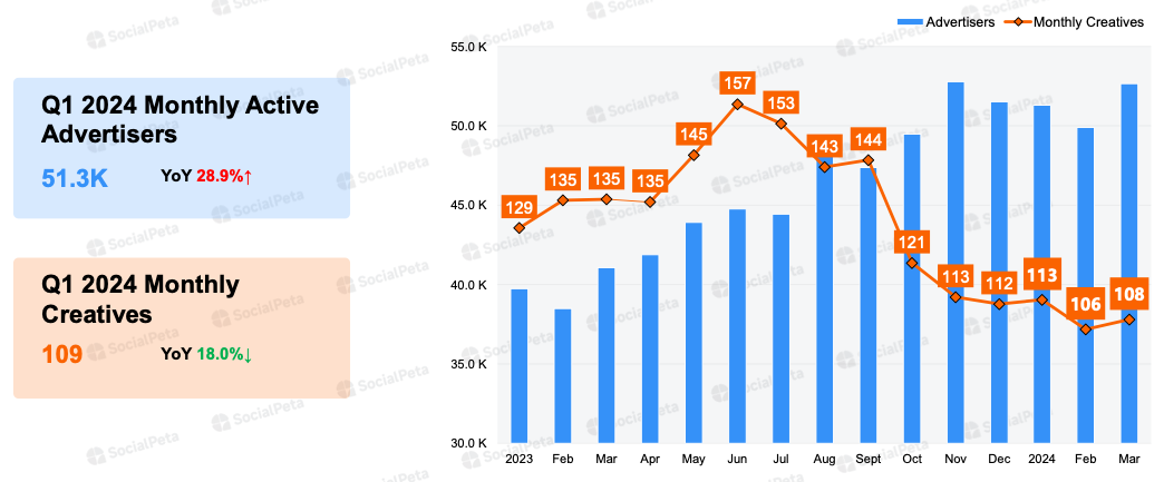 The number of advertisers in Q1’24 increased by 28.9% YoY to 51.3k.