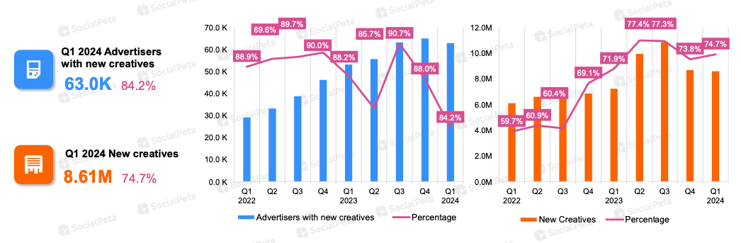 In Q1’24, the share of new creatives in the market was 74.7% - slightly below the 2023 average. The share of advertisers with new creatives was 84.2% - lower than in the past two years.