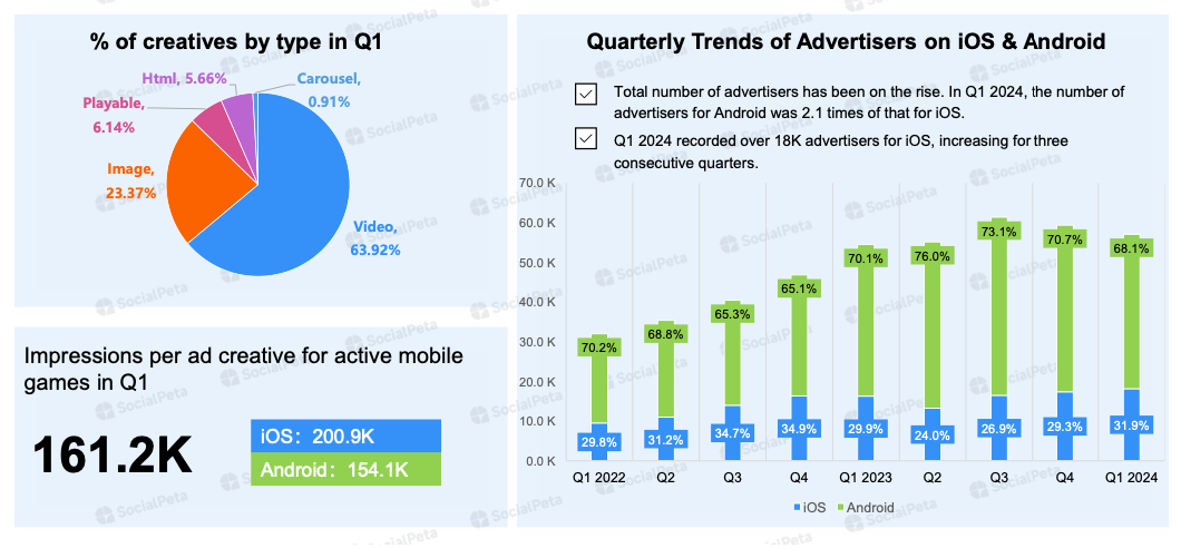 63.92% of creatives in Q1’24 were videos; 23.37% were static images; 6.14% were Playable ads; 5.66% were HTML creatives; 0.91% were carousel ads.