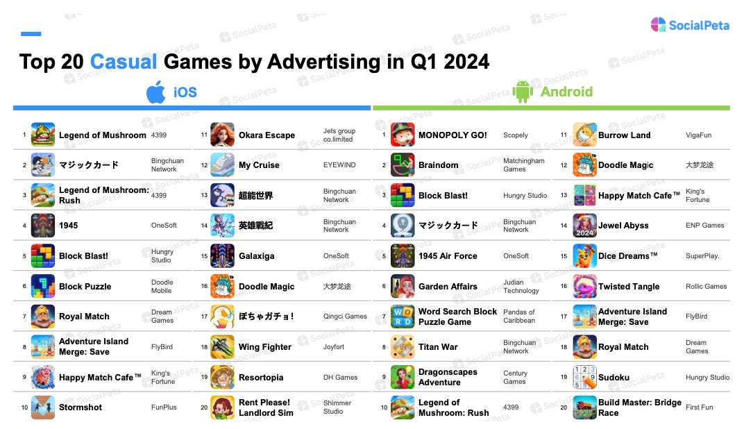 Legend of Mushroom, Magic Card, and 1945 led the casual segment by advertising on iOS. On Android, the leaders were Monopoly GO!, Braindom, and Block Blast!