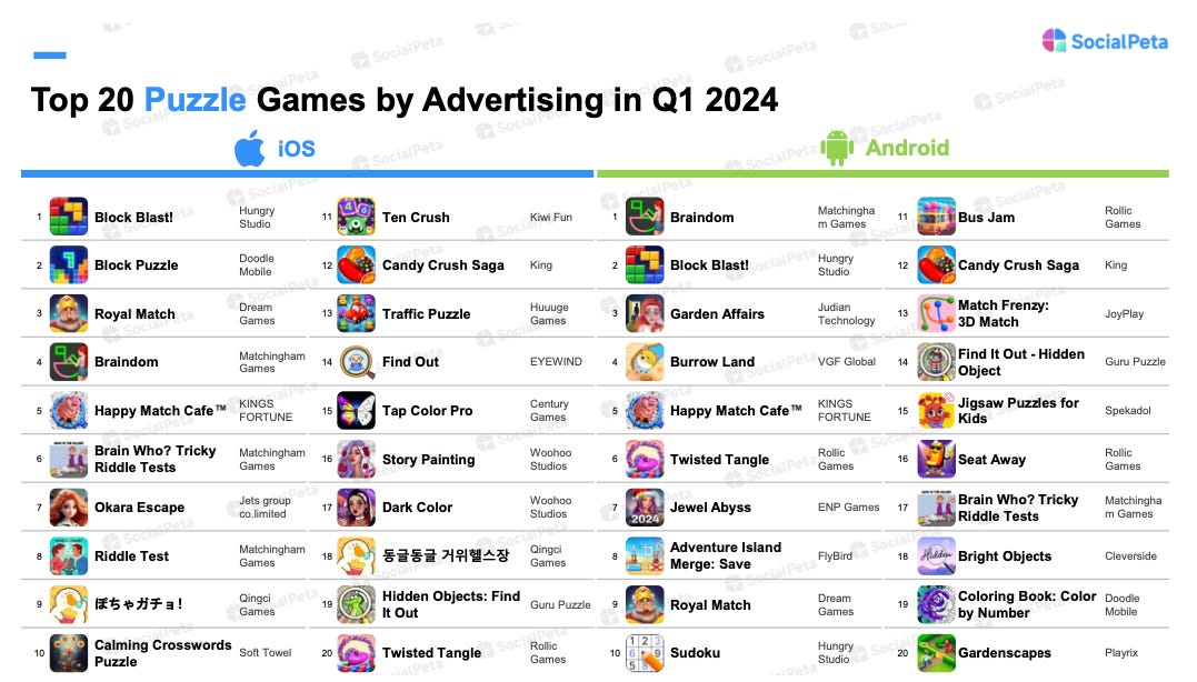 - The top puzzle advertisers were Block Blast!, Block Puzzle, and Royal Match on iOS; and Braindom, Block Blast!, and Garden Affairs on Android.