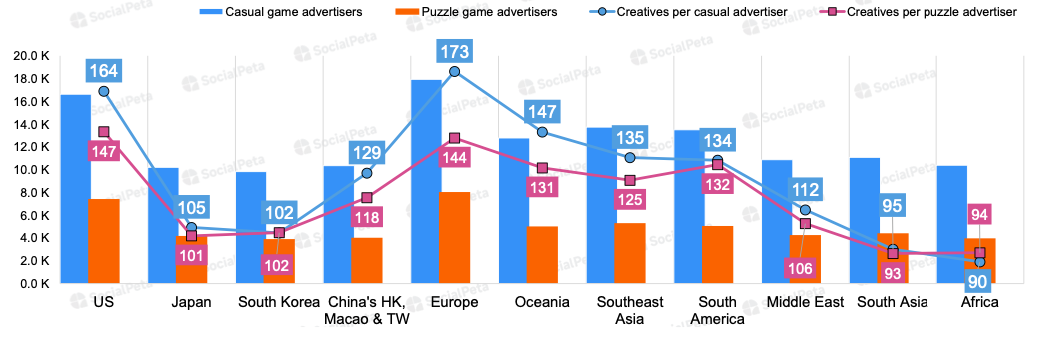 The most popular languages for ad creatives in casual (and puzzle) games are English, Traditional Chinese, Japanese, Portuguese, and Korean.