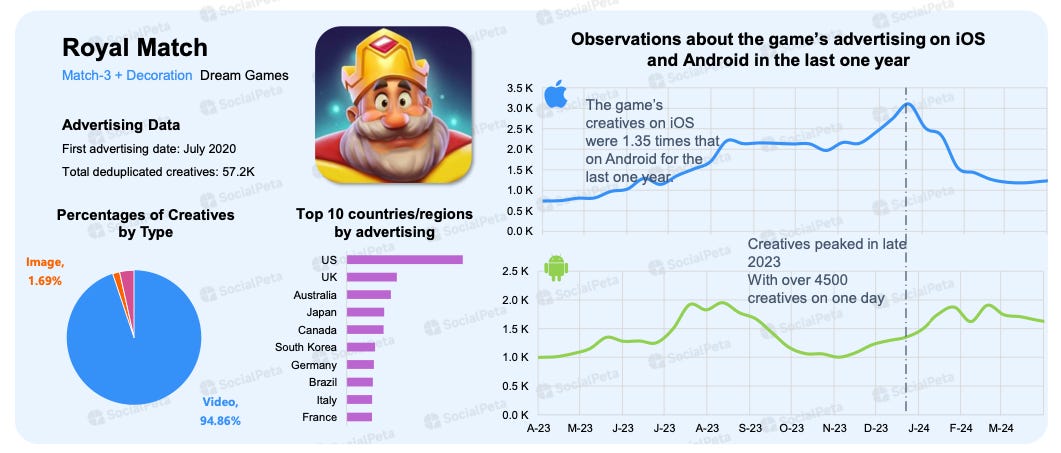 - Royal Match: At the end of 2023, Royal Match had more than 4,500 creatives in operation. The average number of creatives on iOS was 1.35 times higher than on Android. 94.86% of all creatives were videos. The main markets for the project were the USA, the UK, Australia, Japan, and Canada. However, since the beginning of 2024, the number of creatives on iOS has been decreasing, while on Android it has been increasing.