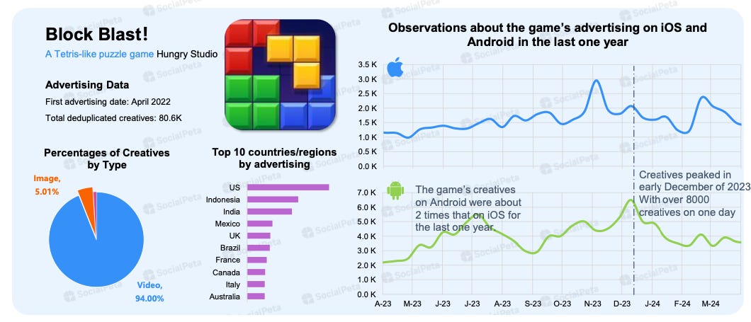 Block Blast!: At the end of 2023, Block Blast! had more than 8,000 active creatives. There were 2.5 times more creatives on Android than on iOS.
