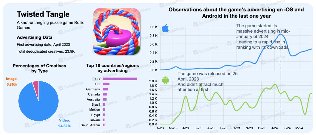 Twisted Tangle by Rollic Games: This game was primarily advertised on Android for a long time. Growth on iOS occurred almost a year after testing. The main market for advertising was the USA.