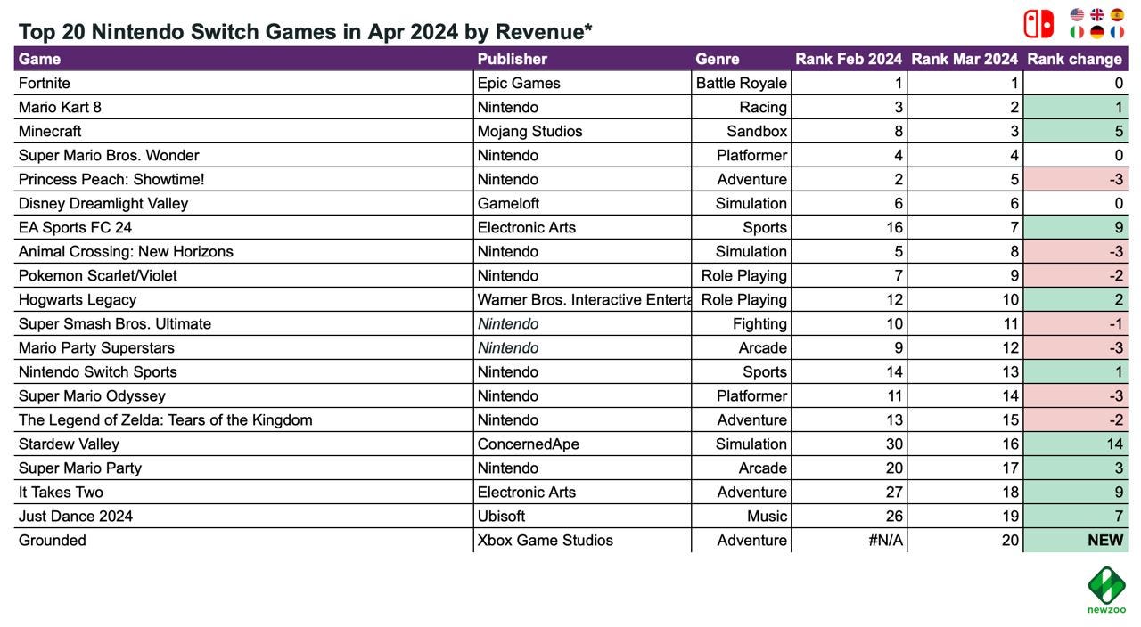 On Nintendo Switch, everything remained stable, with Grounded being the only new game in the top 20 revenue chart.