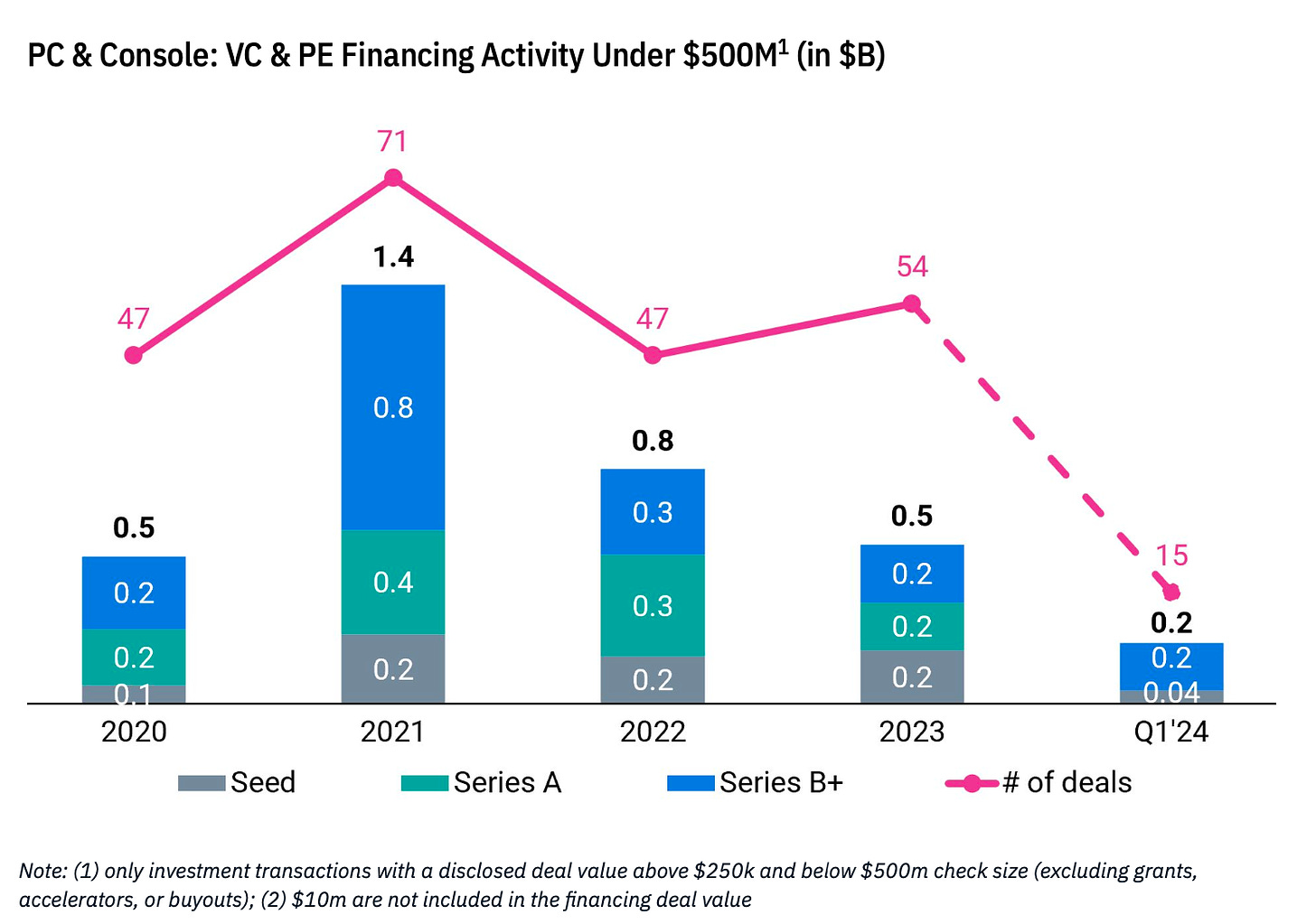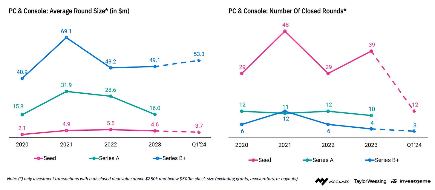 The number and volume of Seed rounds for PC/console developers have remained almost unchanged over the years, while Series A+ rounds have decreased both in volume and quantity.