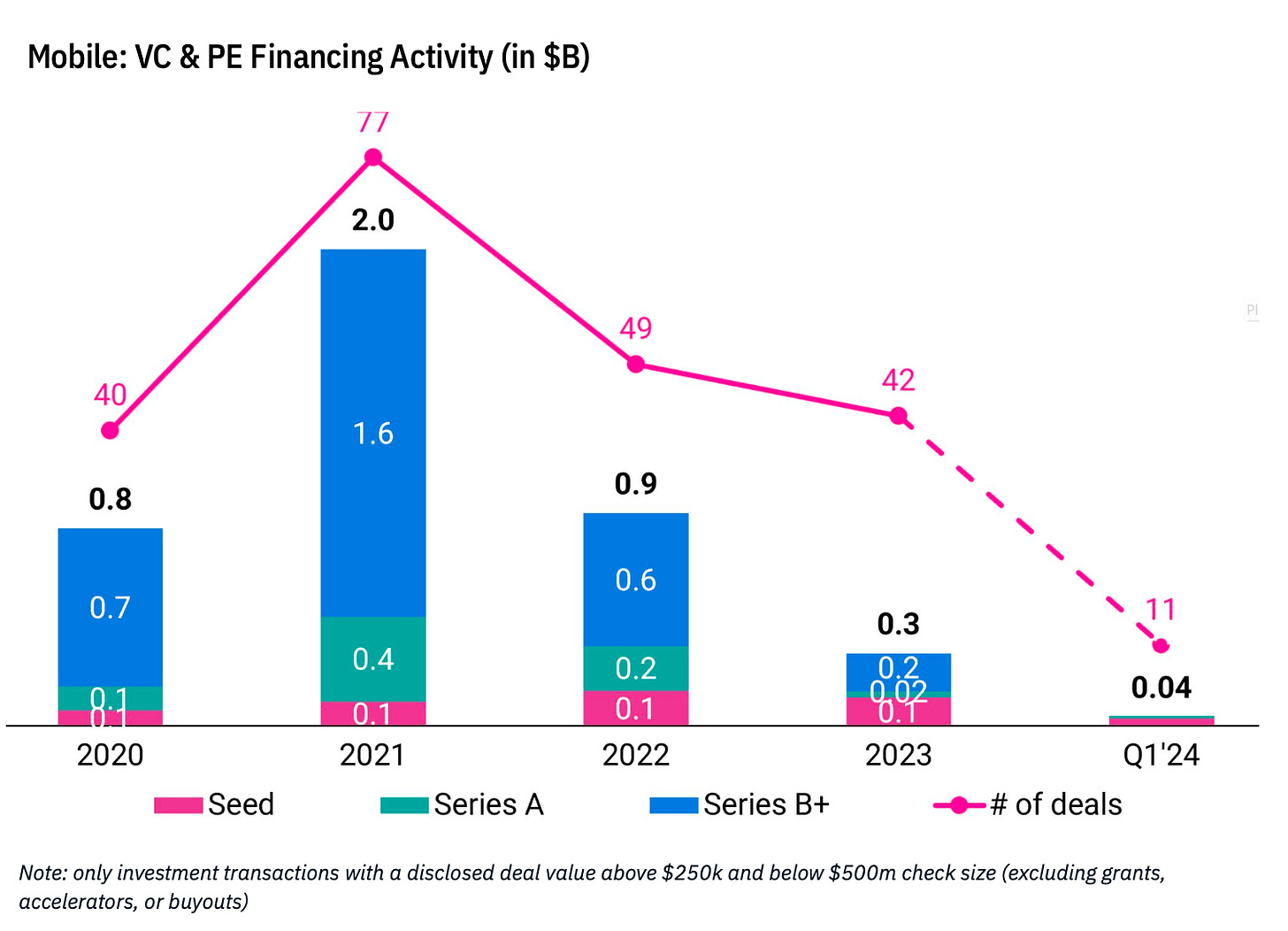 The number of M&A deals with mobile developers has been decreasing since 2021 in terms of both volume and quantity of deals.