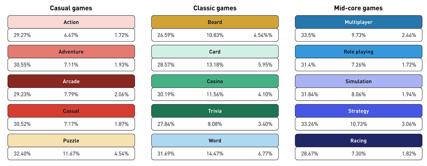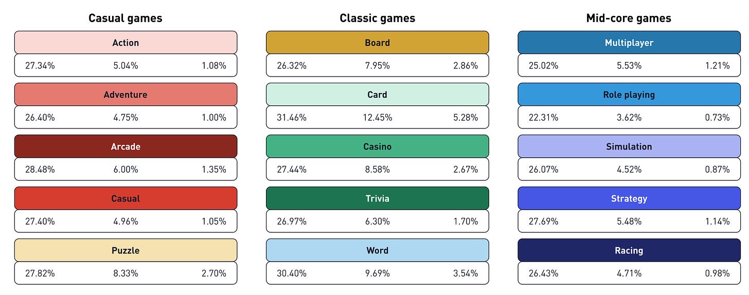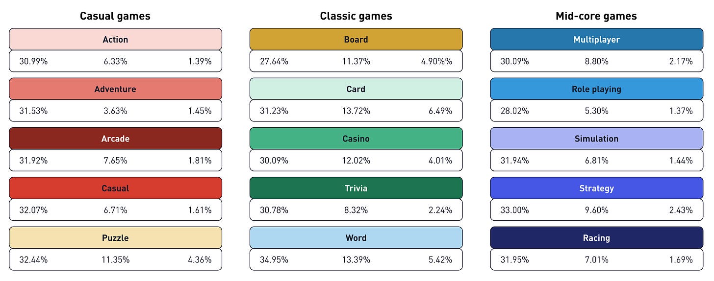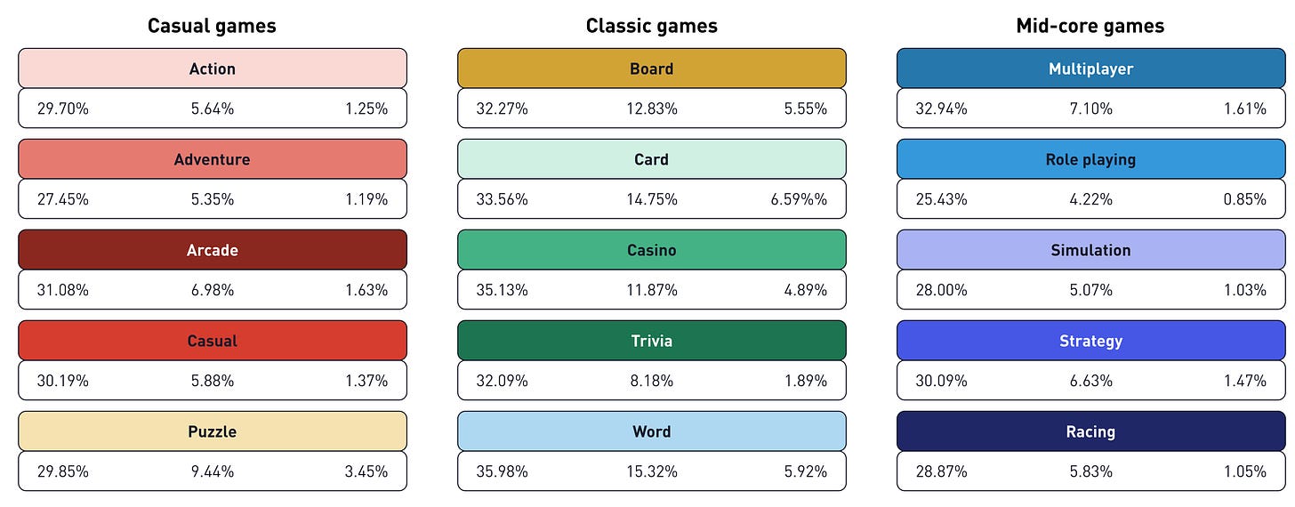 In the Middle East, users favor classic (as defined by GameAnalytics) games such as board, card, and word games. They lead in Retention rates on days 1, 7, and 28. However, casual and mid-core projects show lower figures than in North America and Europe.