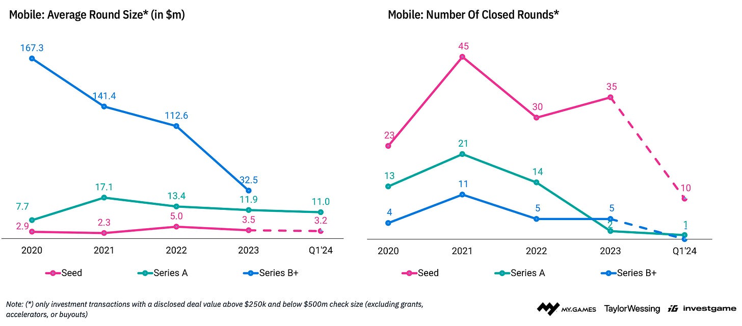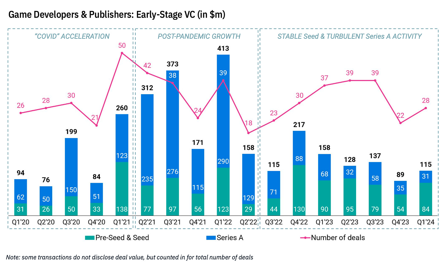 If we consider only investments in gaming companies at stages prior to Series A, then in Q1’24, 28 deals were made totaling $115 million.