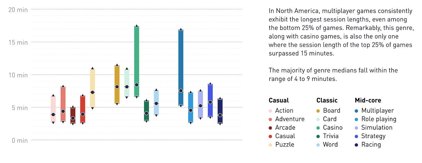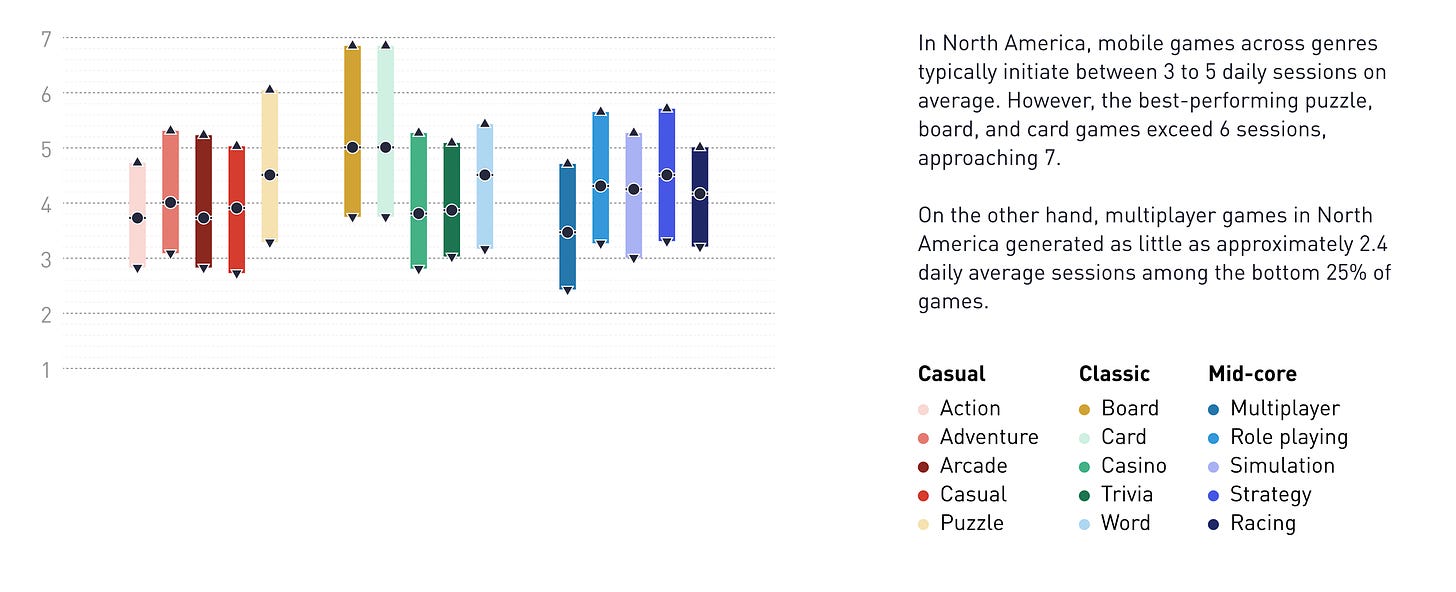 In North America, players typically have 3-5 sessions per day. The highest median values are for board and card games.