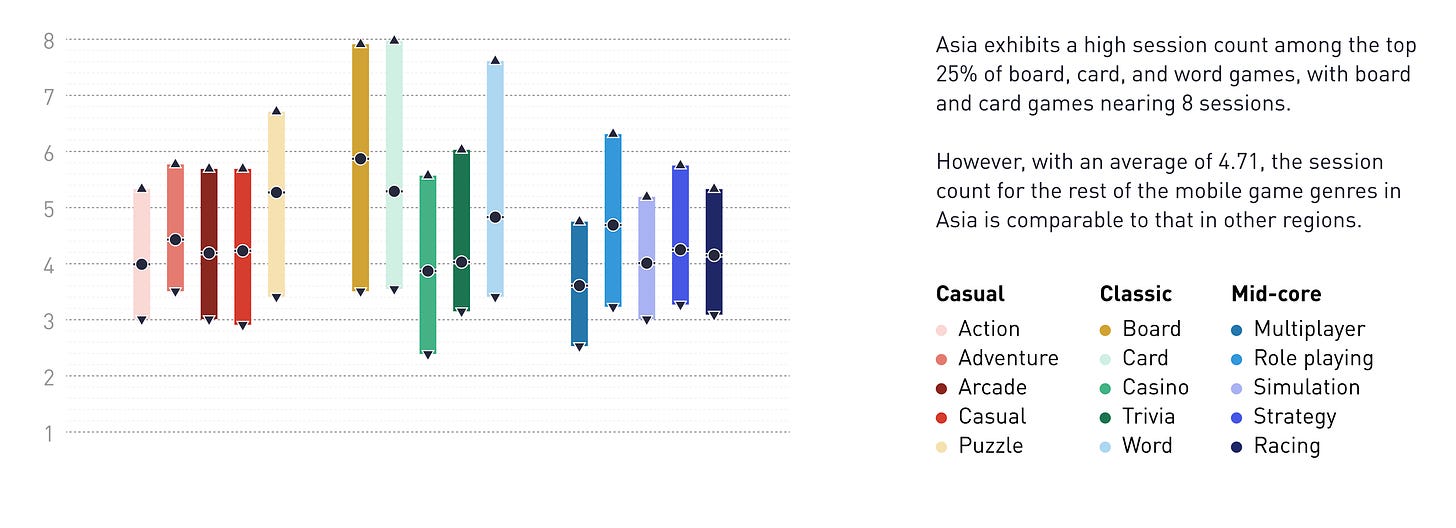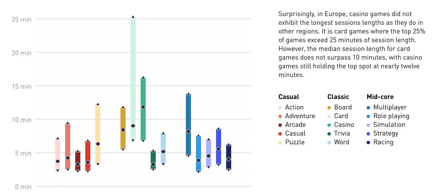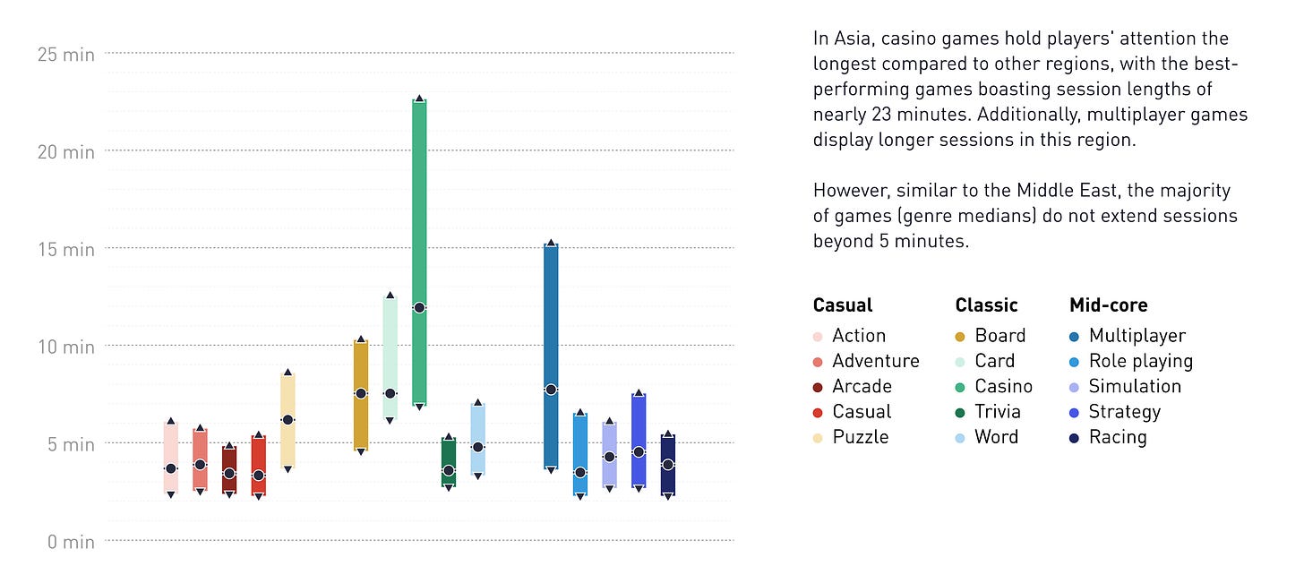 Asian players also enjoy casino games as much as in other regions. However, most genres do not show more than 5 minutes per session when considering median values.