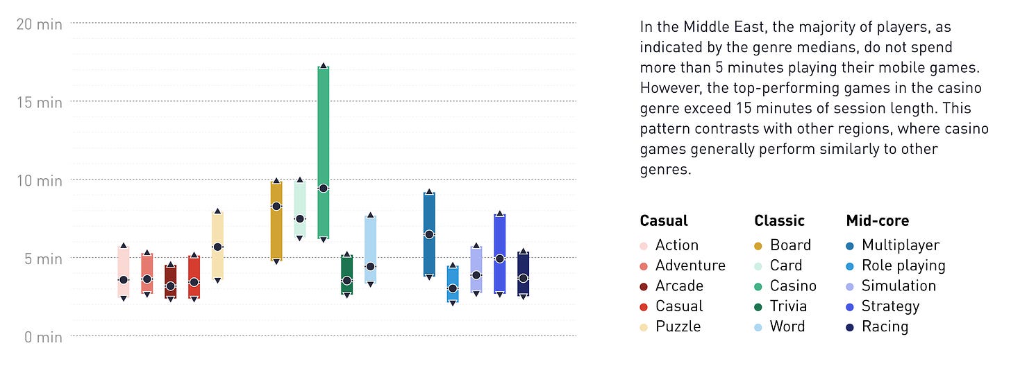 Most players in the Middle East play games for no more than 5 minutes per session. Leading genres are casino and mobile adaptations of board games.