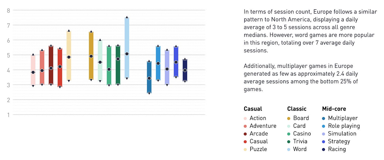 In Europe, word games have the highest number of sessions, reaching up to 7 per day.