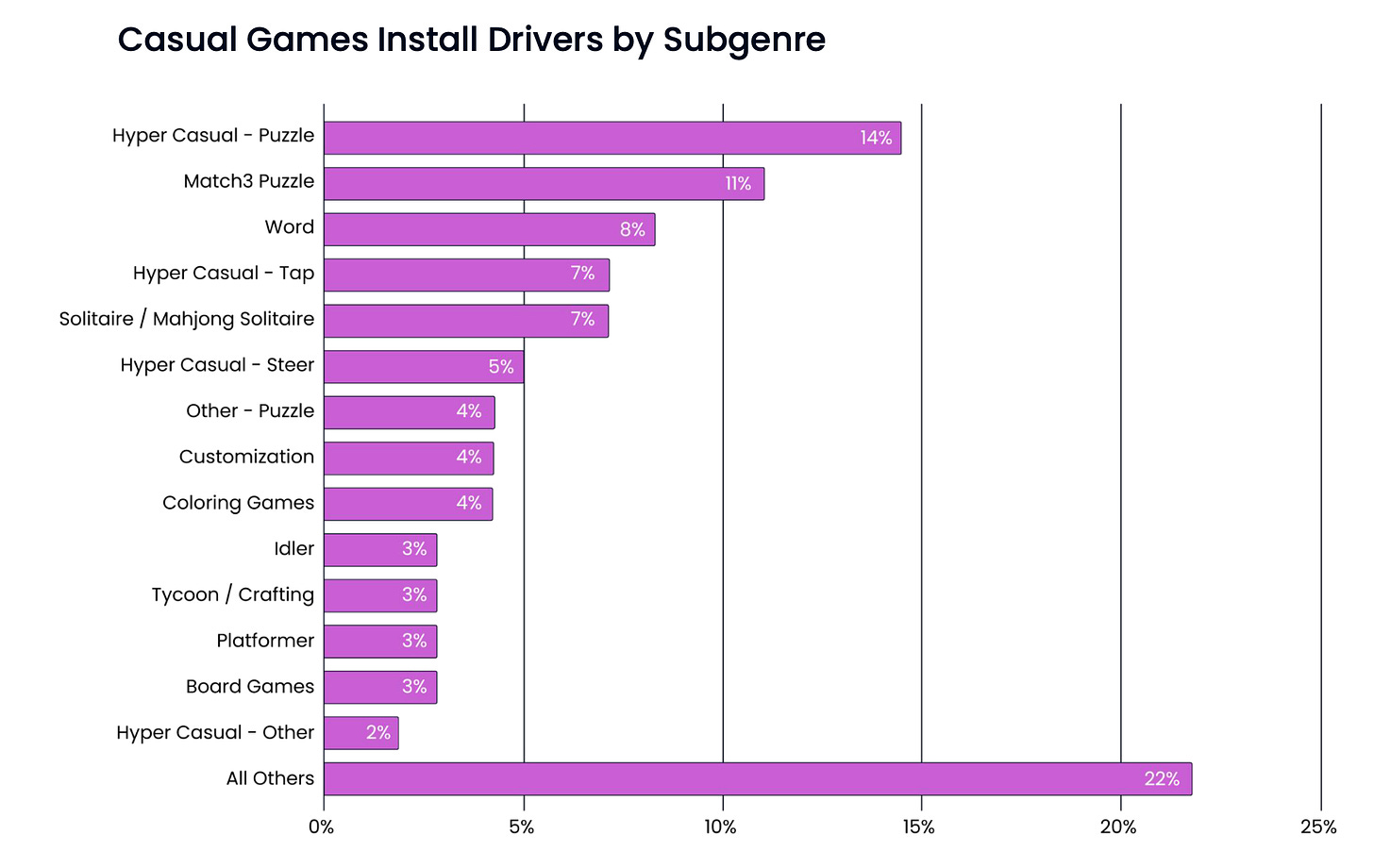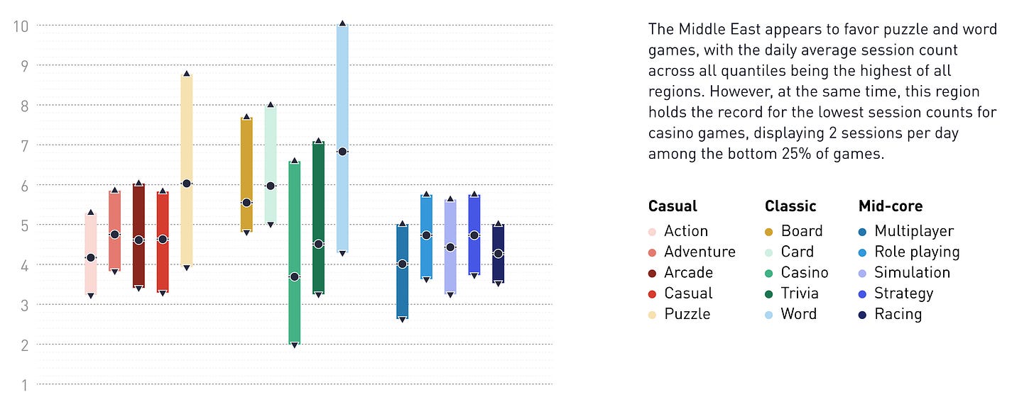 The number of sessions in games in the Middle East is higher than in other regions. Leading genres are puzzles and word games.