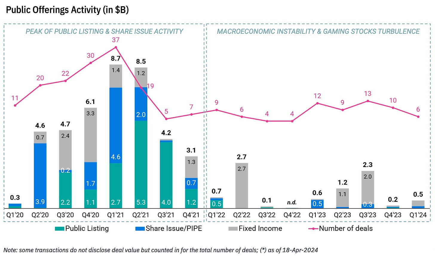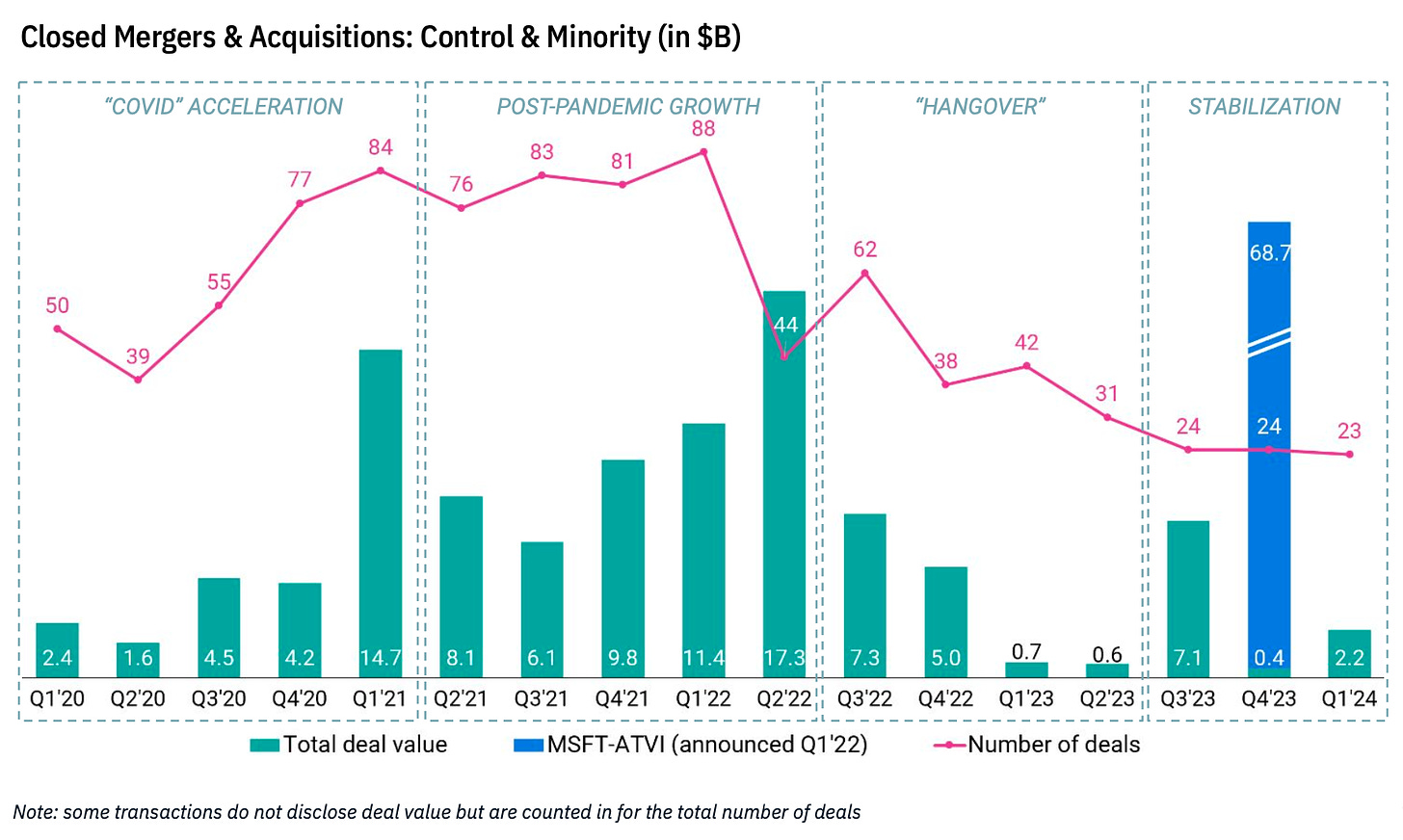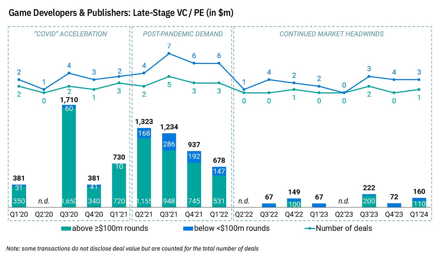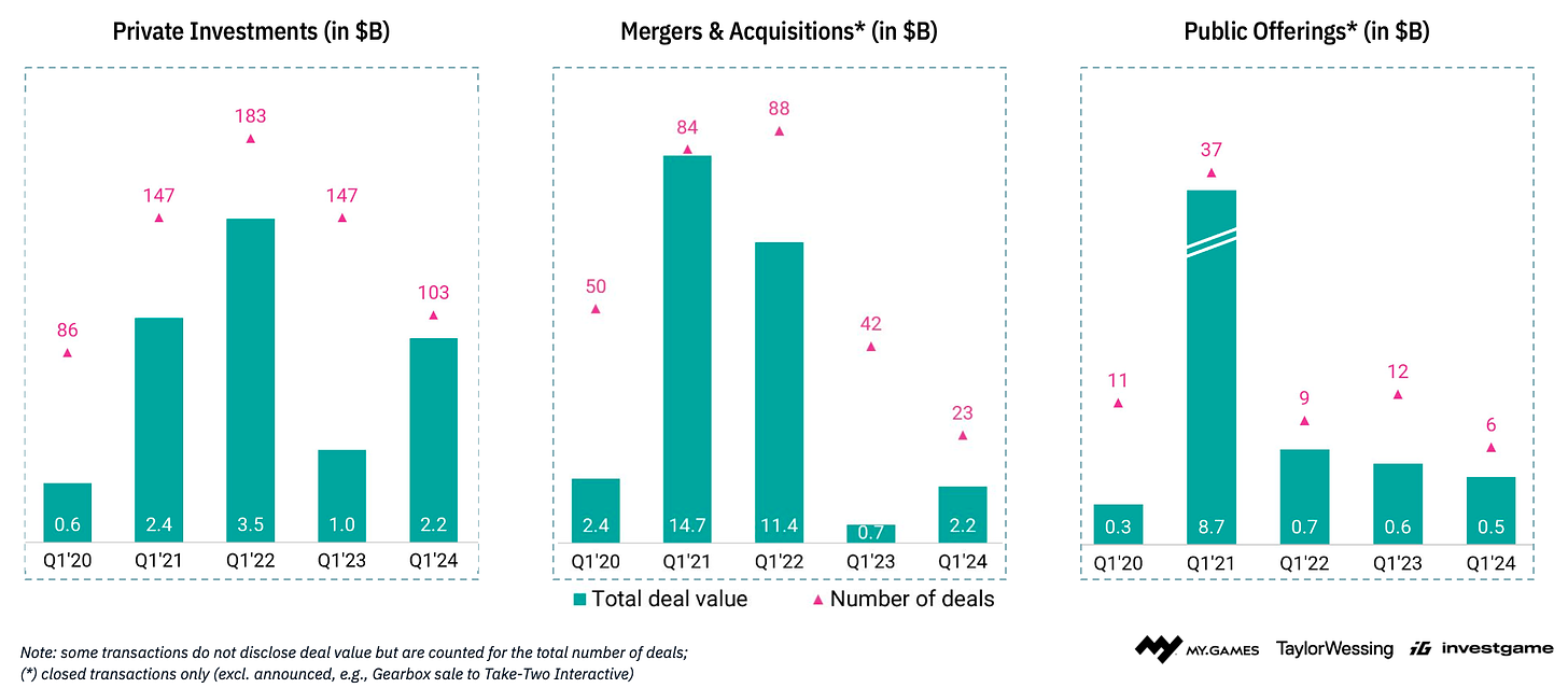 - Private investment volume in Q1’24 reached its peak since Q3’22 - $2.2 billion. However, it's important to note that $1.5 billion is attributed to the deal between Disney and Epic Games.