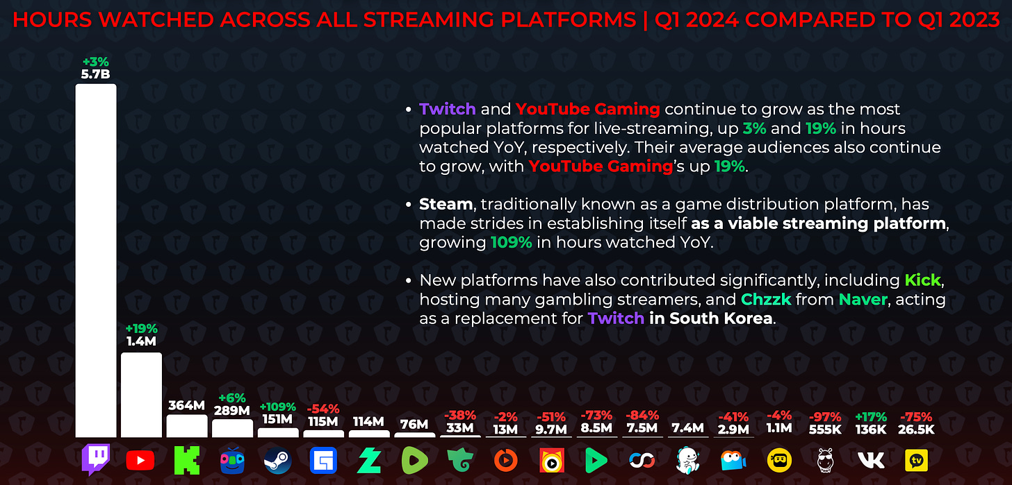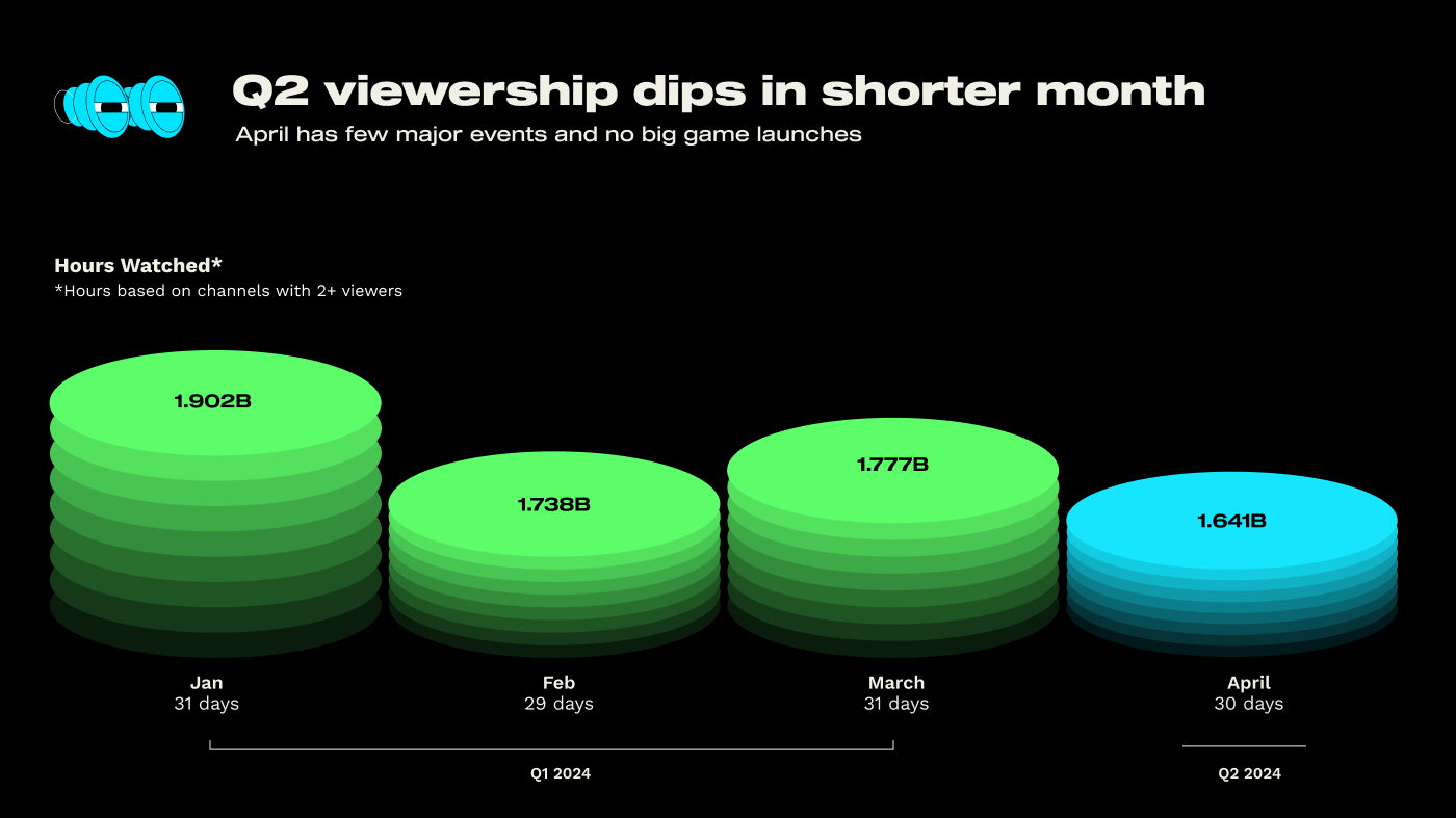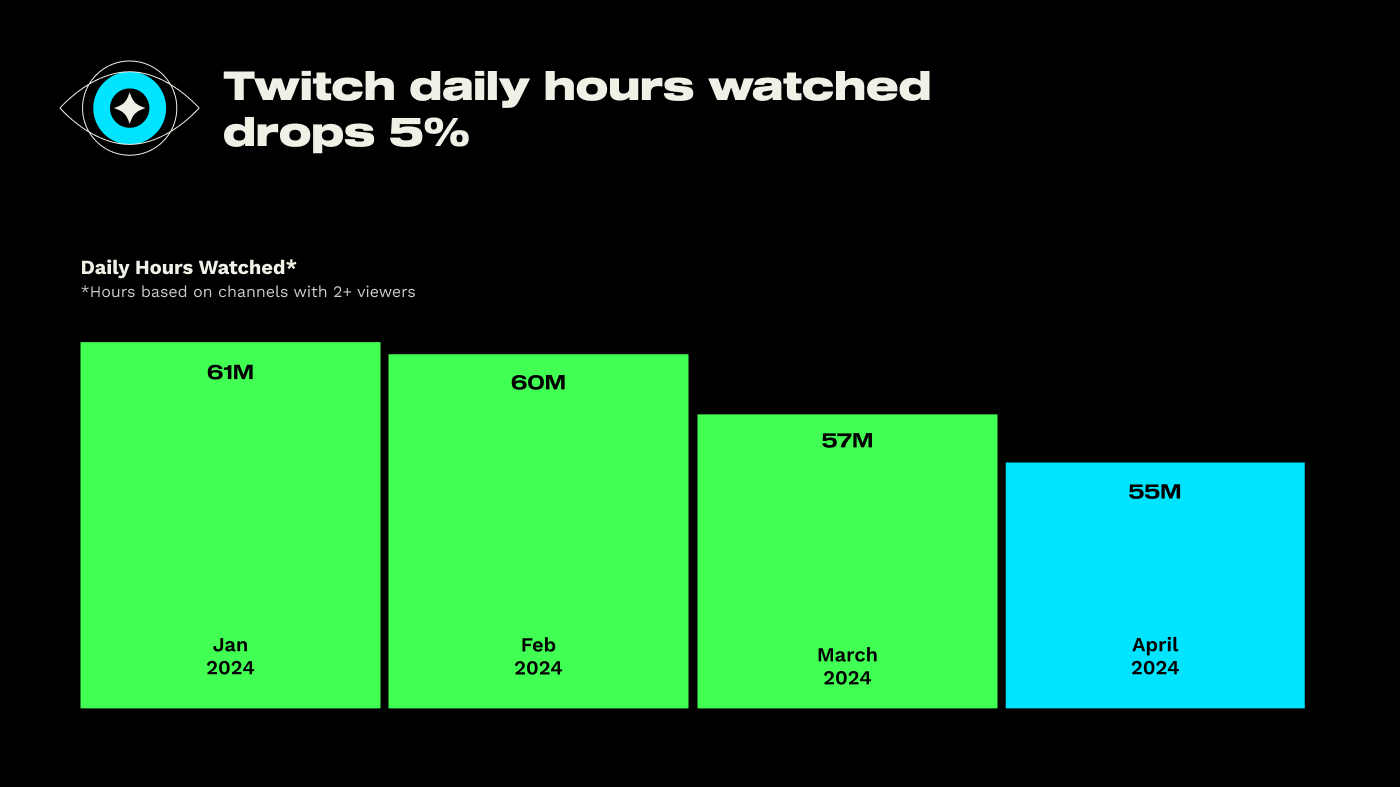 - The number of hours watched on Twitch in April dropped by 8% compared to the previous month. When compared to April 2023, the decline was less than 2%.
