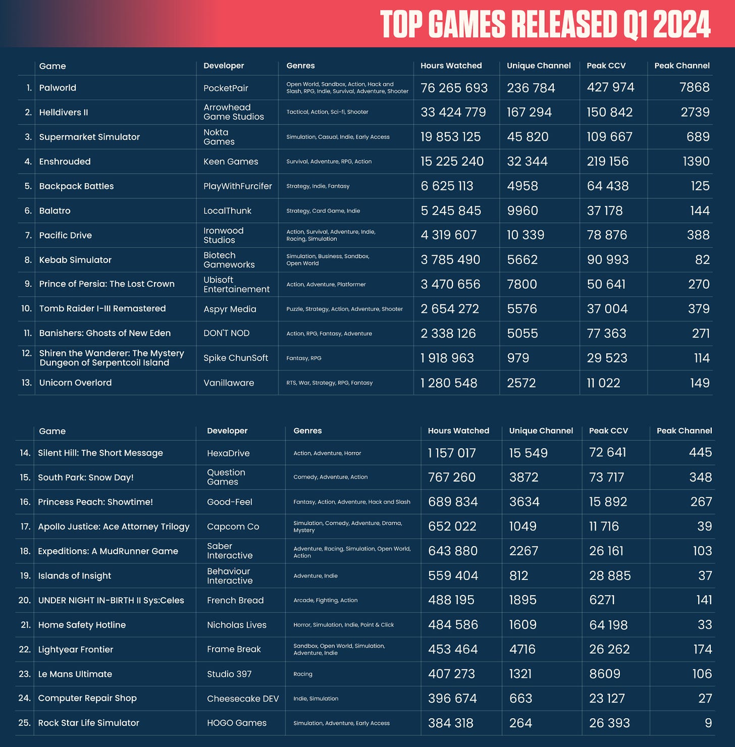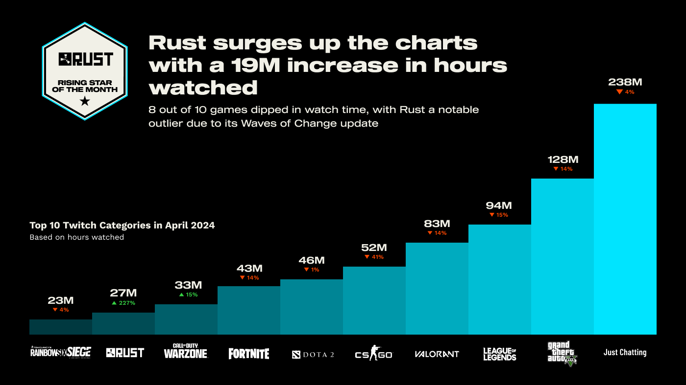 Rust climbed to 8th place in viewership on Twitch in April 2024. The number of hours watched in April increased by 227% due to a new update.