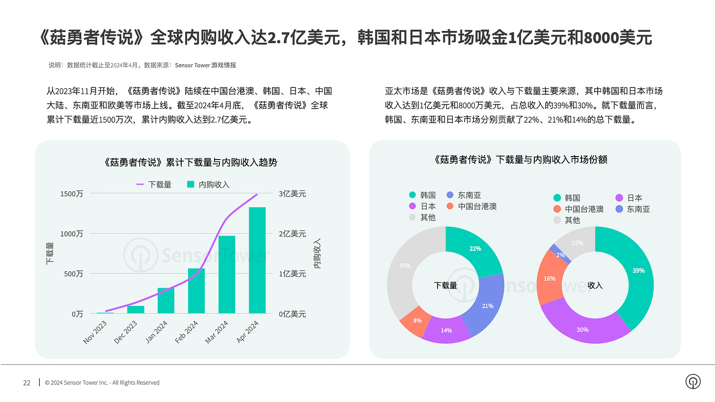 - Revenue for Legend of Mushroom reached $270 million by the end of April 2024. The majority of cash comes from South Korea (39.4%) and Japan (30%). In these countries, the male audience for the project exceeds 80%.