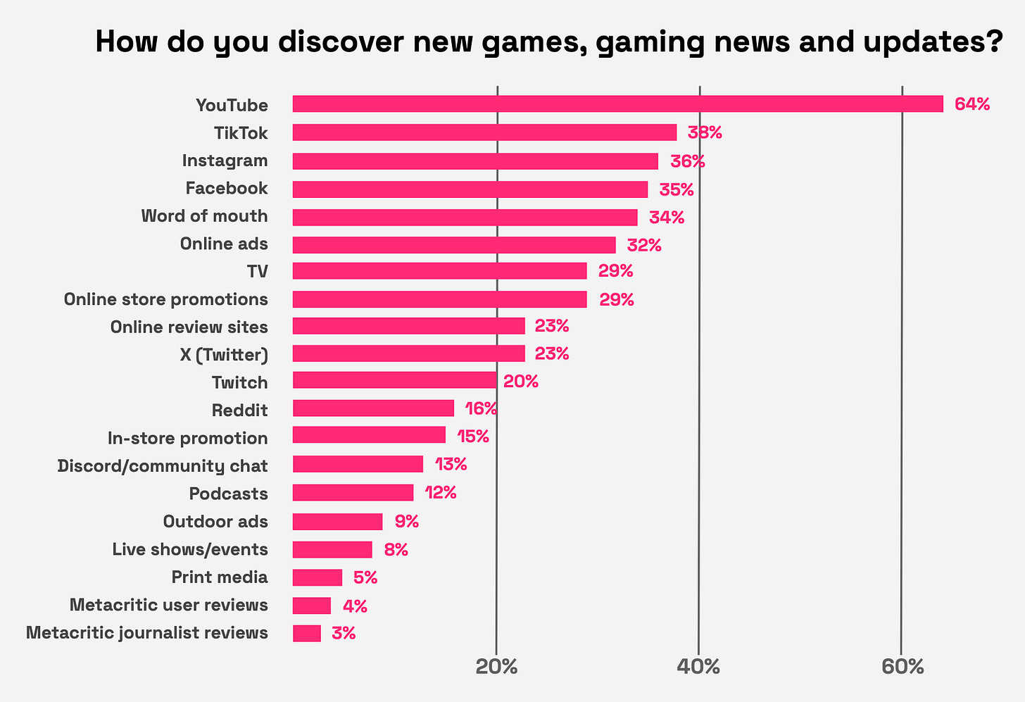 64% of players learn about new games from YouTube. This is the most popular channel.