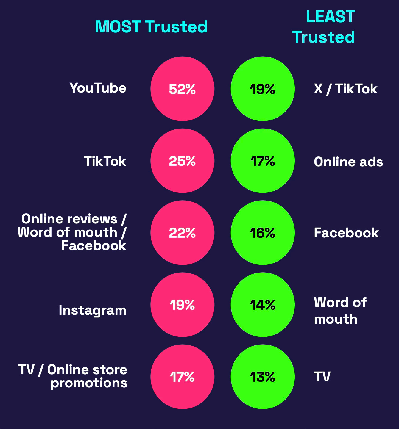 YouTube is the most trusted by players - 52% of respondents indicated this. TV advertisements are the least trusted - 13%. Opinions are polarized - for example, some people trust TikTok, while others do not.