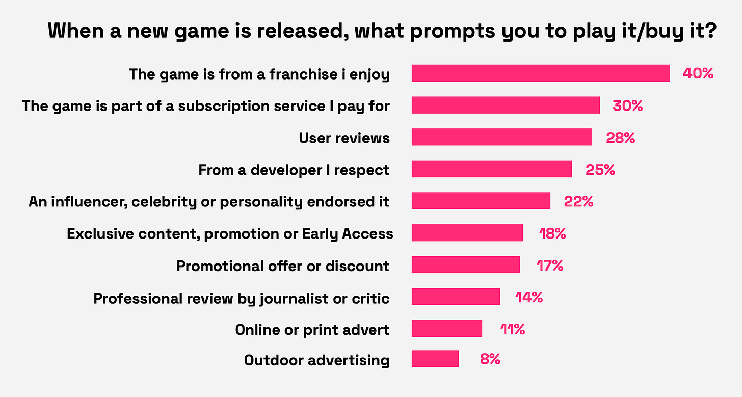 - People are inclined to try a new game if it is a new installment of their favorite franchise (40%); the game is included in a subscription (30%); it has good reviews from players (28%); it is released by a developer they like (25%). Overall, people prefer familiar franchises and developers.