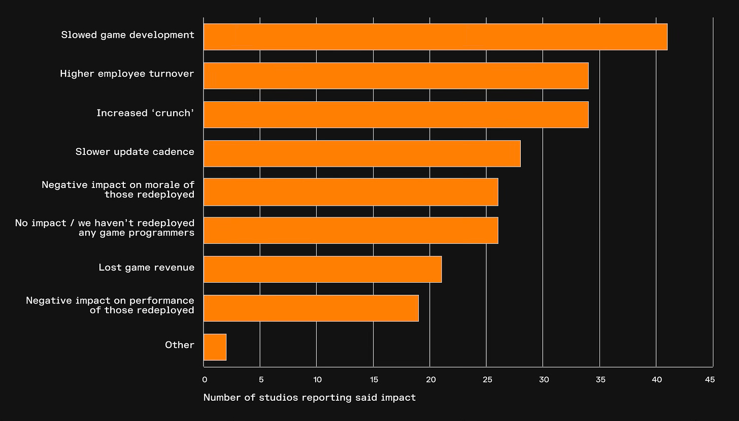 - Metaplay notes that every third studio reported negative effects from reallocating personnel to develop custom backend solutions. This slowed down product development, provoked employee turnover, and increased the amount of crunch.