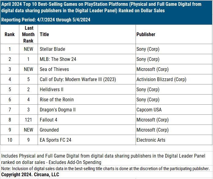 In the top 10 PlayStation sales, there are several new releases. Stellar Blade is in 1st place, Sea of Thieves is in 3rd place, and Grounded is in 9th place. Fallout 4 also returned to the top 10. Interestingly, these three games are published by Microsoft.