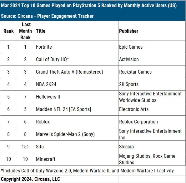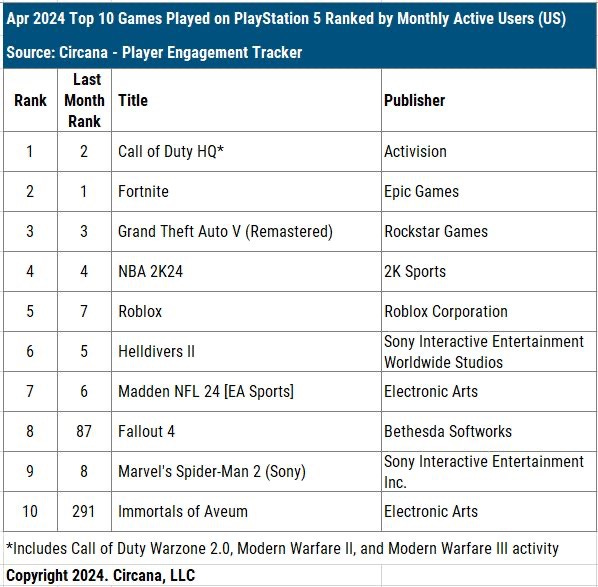 The leaders in MAU (Monthly Active Users) on PlayStation are Call of Duty (all games), Fortnite, and Grand Theft Auto V. Fallout 4 entered the ranking (thanks to the success of the series), as did Immortals of Aveum (the game is available in PS Plus).