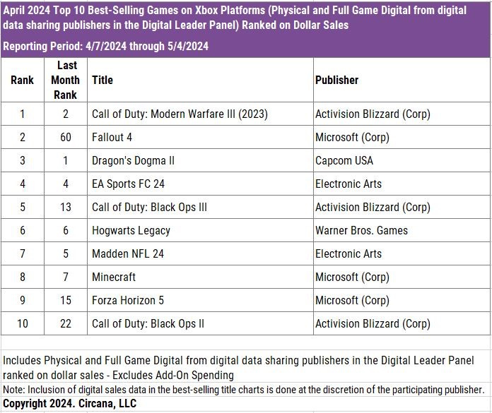 On Xbox, there are no new releases in the charts, but Fallout 4 returned to the top 10, ranking 2nd in April.