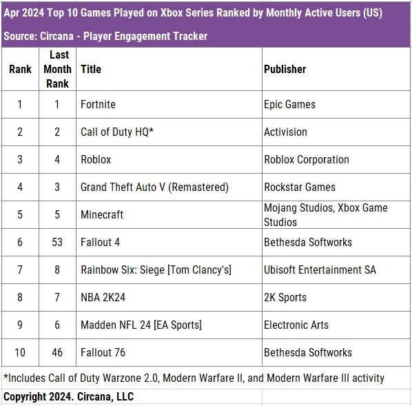 The leaders in MAU on Xbox are Fortnite, Call of Duty, and Roblox. Fallout 4 and Fallout 76 also made it to the top 10.
