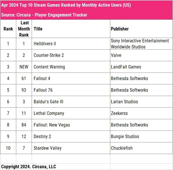 - The leaders in MAU on Steam are Helldivers II, Counter-Strike 2, and Content Warning from Landfall Games. Fallout 4, Fallout 76, and Fallout: New Vegas also made it to the top 10.