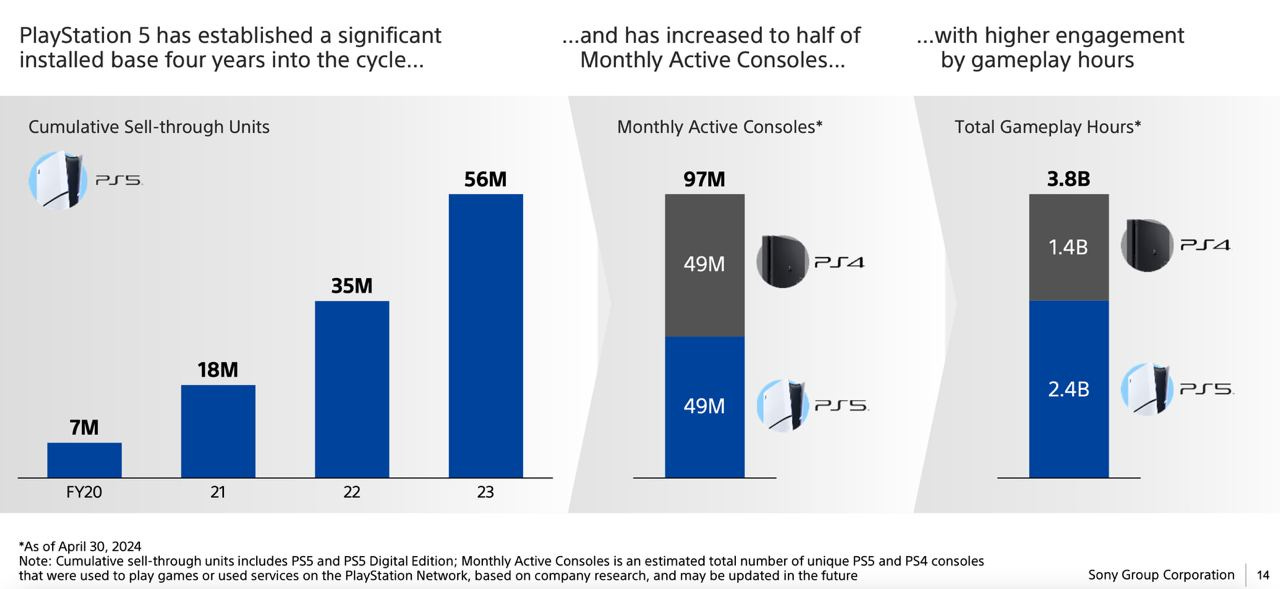 Sony's presentation includes the metric Monthly Active Consoles. According to this statistic, there were 97 million active PlayStation consoles worldwide in April 2024. Half of them are PS5s, and half are PS4s.