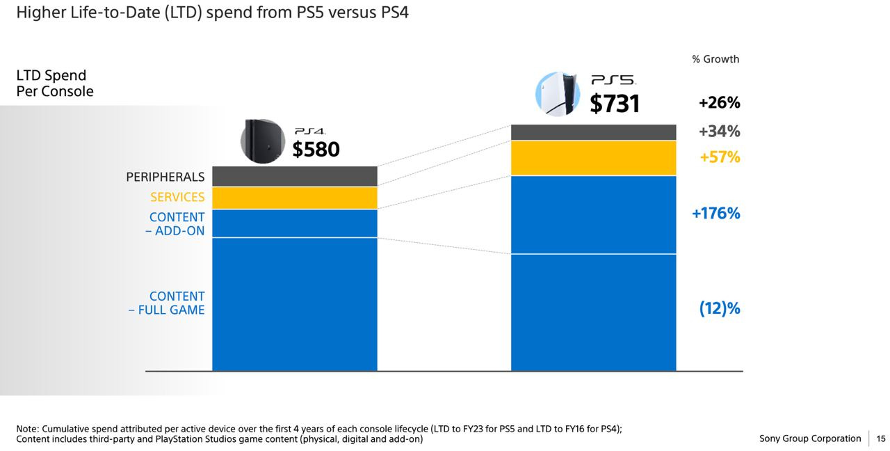 - The cumulative average user spending on the PlayStation 5 over 4 years is $731. This is 26% more than for the same period on the PS4 ($580). Almost all spending segments are growing - in-game purchases (+176%); service spending (+57%); peripheral spending (+34%). Only full game purchases have decreased - they are down 12% compared to the previous generation.