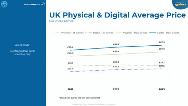 The average price of new physical format games increased by 14% in 2023 (£57), compared to 2021 (£50). A similar percentage growth is seen in digital versions - from £59 in 2021 to £68 in 2023.