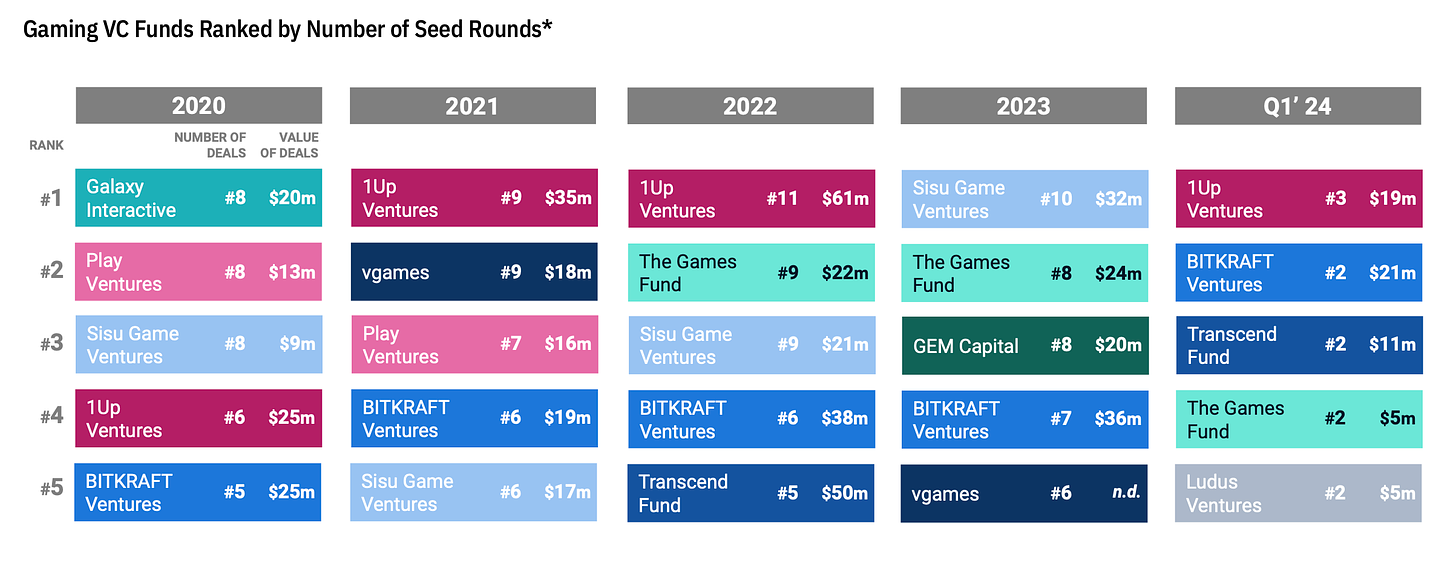 - 1Up Ventures; BITKRAFT Ventures; Transcend Fund; The Games Fund; Ludus Ventures - the most active players in Seed stages in Q1’24.