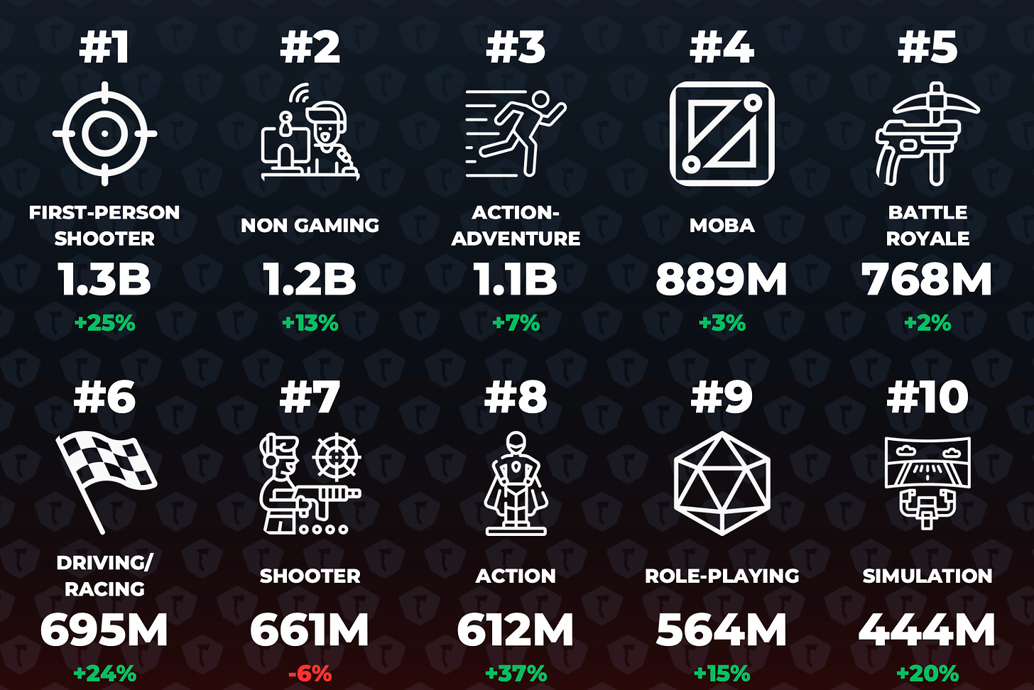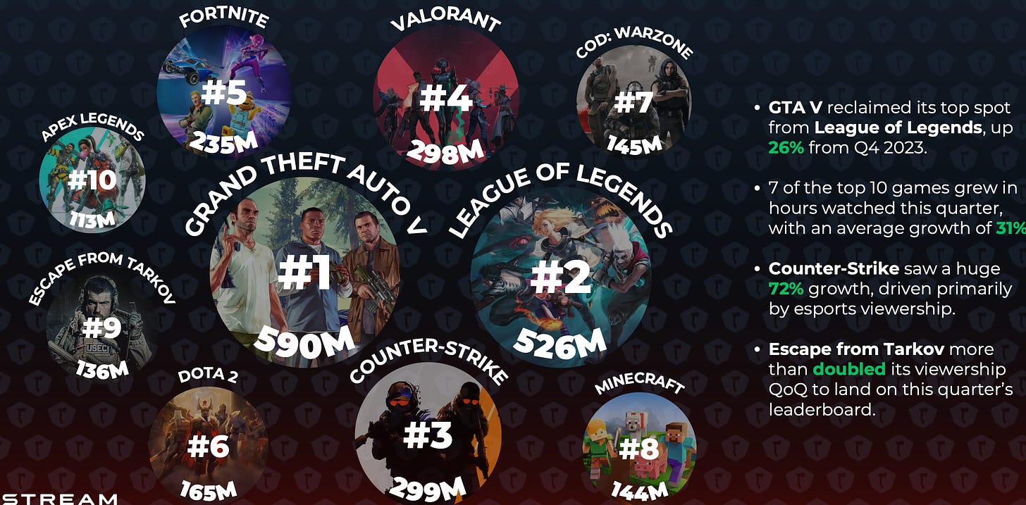 The leaders in viewership remain the same - Grand Theft Auto V (128 million hours); League of Legends (94 million hours); and Valorant (83 million hours).