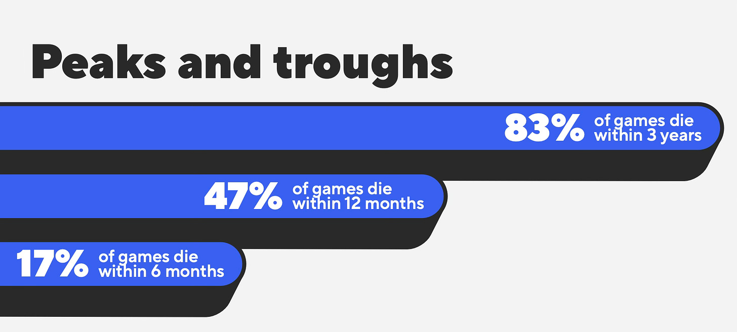 83% of launched games close within 3 years. Only 5% are supported for more than 7 years. Most developers noted that they would prefer to work on new games.