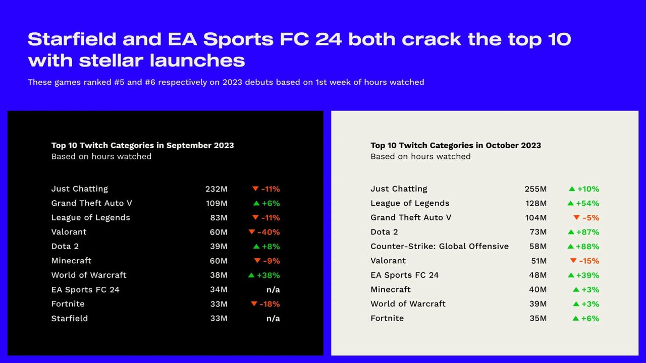 EA Sports FC 24 and Starfield entered the top 10 in terms of hours watched in September and October.