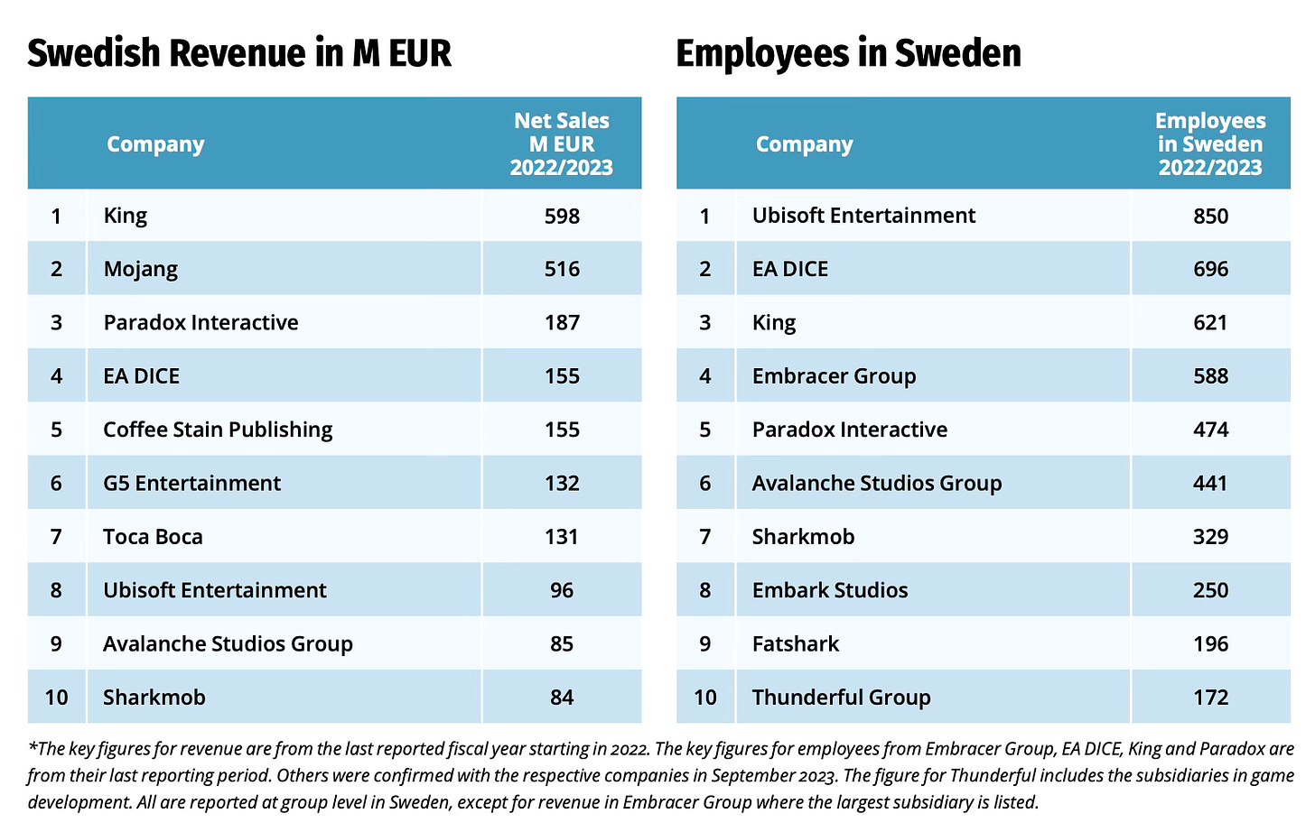 Ubisoft Entertainment (850 people), EA DICE (696 people), and King (621 people) have the most employees in Sweden.
