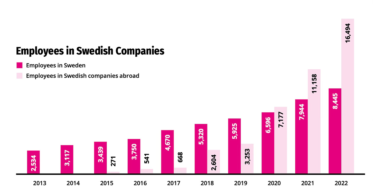In Swedish companies, there were 8,445 employees in the country and 16,494 employees in foreign branches at the end of the 2022 financial year. In Sweden, 501 people were hired in 2022, a 6% increase compared to 2021.