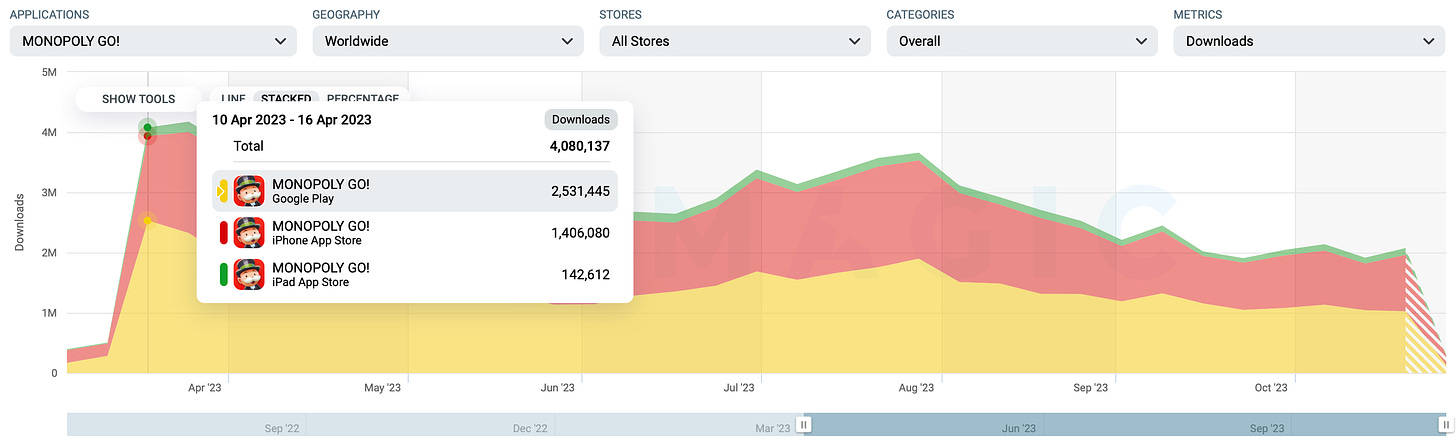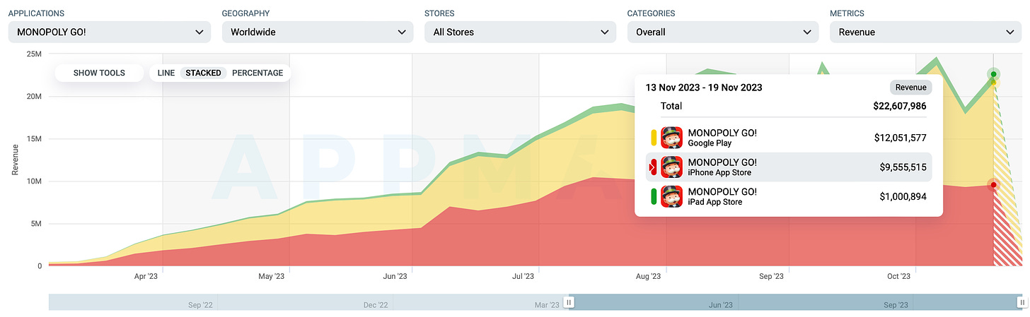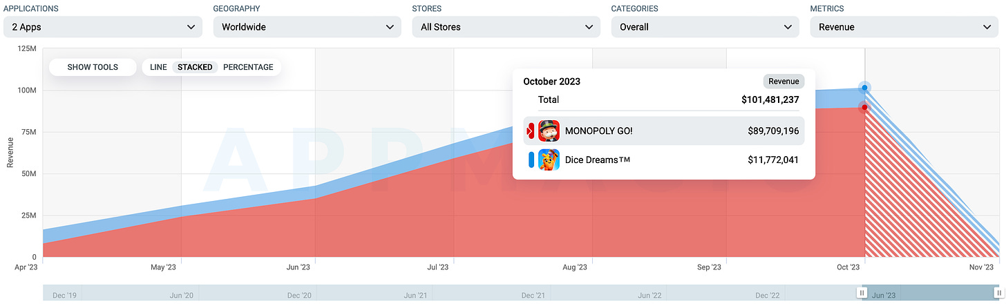 Scopely has announced that MONOPOLY GO! has generated over $1 billion and has become the largest mobile launch of 2023. Let's look at the data and compare it with Dice Dreams.