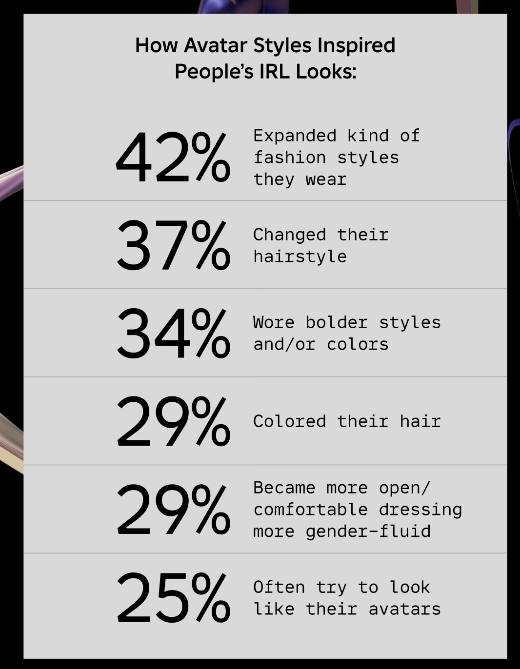 84% of respondents stated that the likelihood of purchasing a branded item in real life increases after they have tried on that item on their digital avatar.