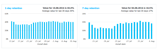 - 7-days retention - the percentage of users who have returned to the application 7 days after the first visit. Users remaining in the application for 7 days, already figured out the usage of the application in more detail and are less likely to leave it in the coming days.