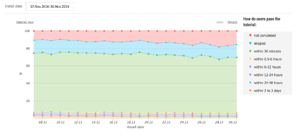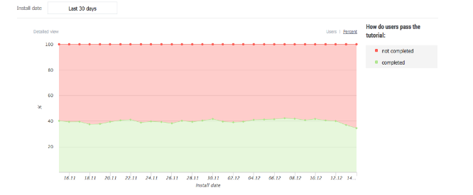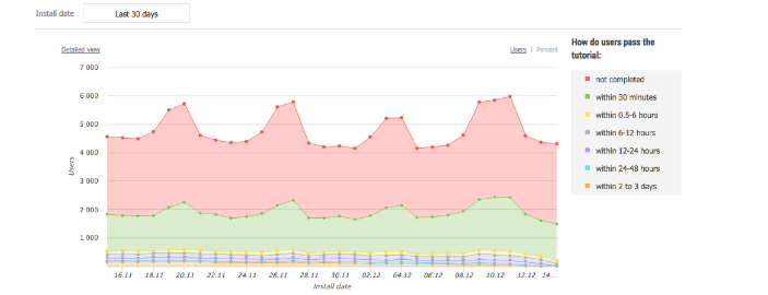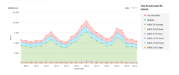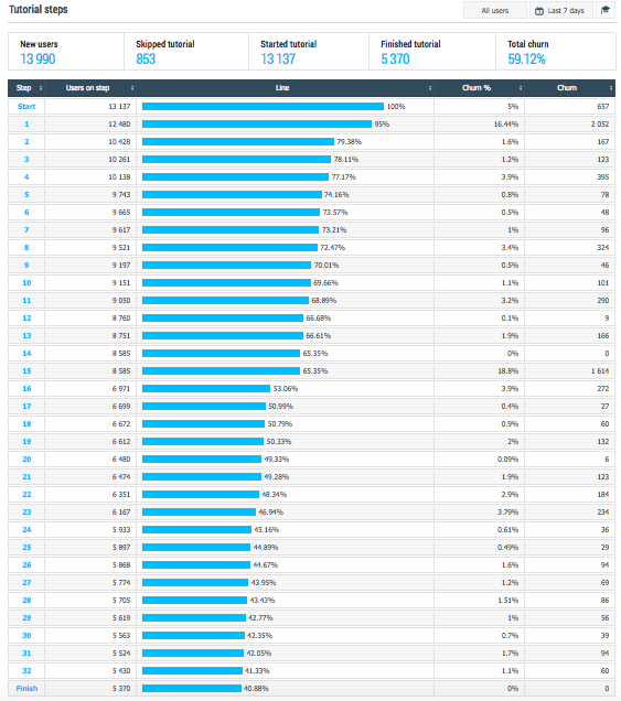 One of our customers has integrated 120 steps of tutorial, including even those steps that are not visible to the user (when the loading of the characters, scenes, textures is performed). And this report has shown that the greatest churn occurs on these invisible levels: tutorial is too heavy and slow, the user simply does not wait until the level is loaded and turns off the application (probably forever). Subsequently, the tutorial was optimized, and the 1-day retention increased by 10%! Considering that the average value of this indicator for the mobile games is about 30%, it's not bad at all.